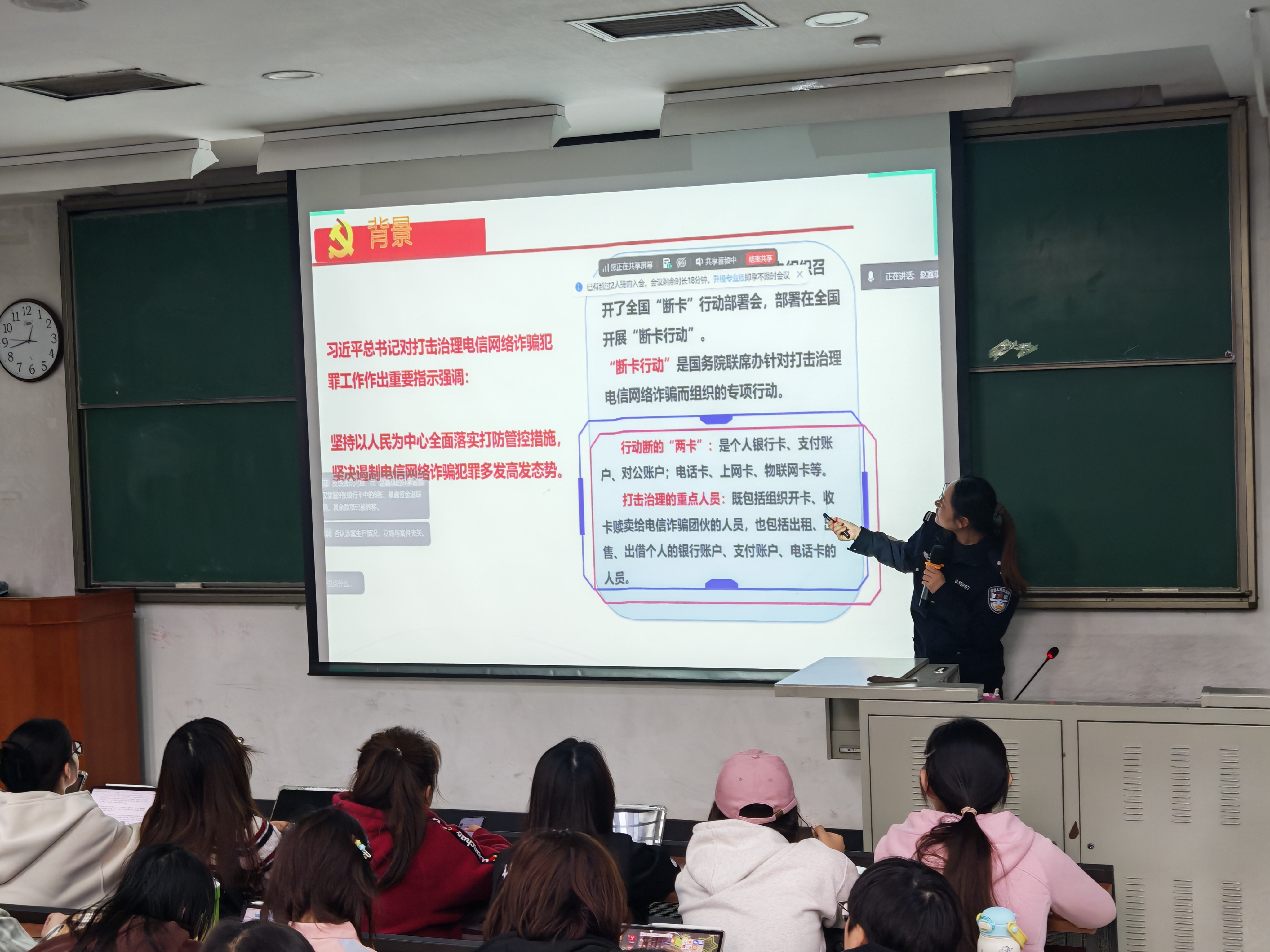近期校内学生遭遇诈骗事件频发,为切实提高同学们的防范意识,414日中午,学院特邀上地派出所张艺曼警官为国际教育与交流学院同学在115教室举行网络诈骗防范宣讲活动,目前电信网络诈骗花样翻新、陷阱重重,早已成为危害大学生财产安全、校园平安稳定的重大隐患。守护青春钱袋子,筑牢校园安全防线,反诈防骗,我们时刻不能松懈!习近平总书记对打击治理电信网络诈骗犯罪工作作出重要指示强调:坚持以人民为中心全面落实打防管控措施,坚决遏制电信网络诈骗犯罪多发高发态势。